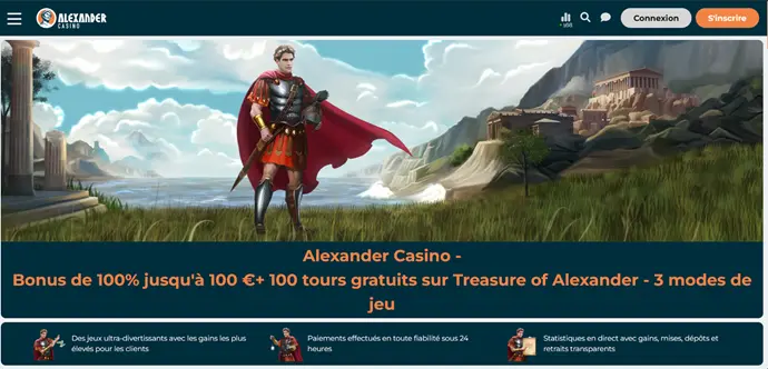 BONUS DE BIENVENUE : 100% JUSQU'À 100 € + 100 TOURS GRATUITS AVEC LA MACHINE À SOUS TREASURE OF ALEXANDER !