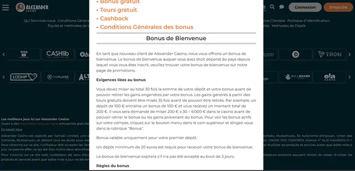 Conditions principales du bonus de bienvenue d'Alexander Casino :