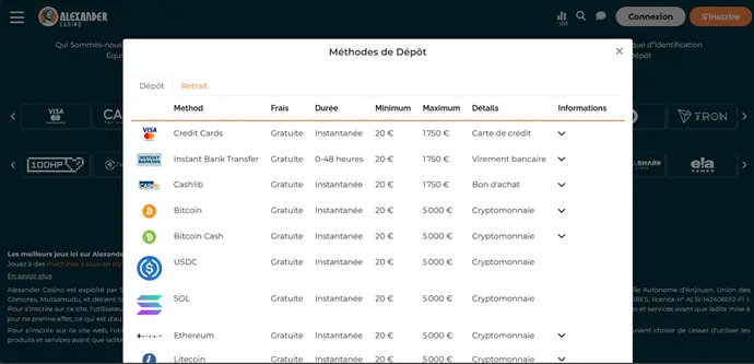 Le dépôt minimum est fixé à 20 €, ce qui rend l’accès au casino relativement accessible. Les dépôts peuvent atteindre jusqu’à 5 000 € par tranche de 24 heures, selon la méthode utilisée, notamment via les crypto-monnaies. Toutes les transactions sont annoncées comme sans frais, ce qui améliore la lisibilité des opérations bancaires.