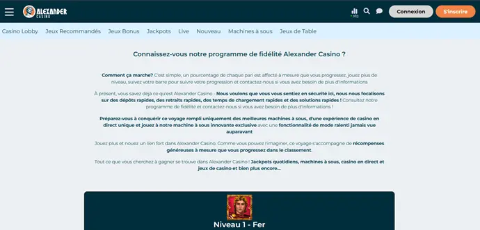 Pour vous qui consultez cette revue sur Kynox Casino afin de comparer Alexander à d’autres casinos en ligne, la section VIP constitue un indicateur fort du positionnement de la plateforme. Elle montre un casino qui cherche à construire une relation durable avec ses joueurs, en récompensant la constance, la progression et l’engagement réel, plutôt que de se limiter à des promesses marketing.