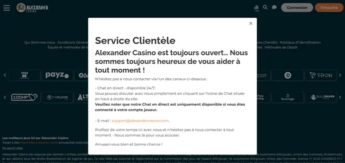 Pour vous qui consultez cette revue sur Kynox Casino, cette section communication répond pleinement à l’intention de recherche : savoir si Alexander Casino est compréhensible, structuré et digne de confiance avant de créer un compte.