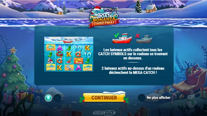 La machine à sous vidéo Boat Bonanza Christmas par Play'n Go respire au rythme de ses fonctionnalités. Elles ne sont pas juxtaposées mais plutôt connectées entre elles. Elles sont comme des mouvements dans l’eau glacée.