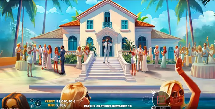 Dans le jeu de base, l’ambiance est celle d’une fête permanente. Paradoxalement, elle y est étonnamment silencieuse. Des femmes en bikini se tiennent au bord de la piscine, les regards sont confiants, les gestes lents et chorégraphiés. Le champagne coule, l’argent circule, mais sans excès visible. Rien n’explose car absolument tout est maîtrisé. Les symboles du jeu prolongent cette impression de luxe codifié : symboles Illuminati, billets roulés, cartes, cocktails aux couleurs vives, fleurs éclatantes comme des offrandes modernes. Le plaisir est là, mais il est encadré.