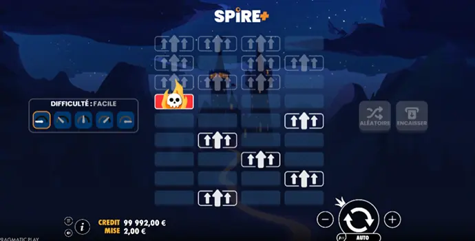 - En mode Easy, vous disposez de plusieurs win spots pour une seule case perdante. La montée est fluide et pédagogique. Vous prenez confiance, vous observez le rythme et vous comprenez comment le multiplicateur évolue. C’est le mode idéal pour découvrir Spire+ en démo gratuite, sans pression.