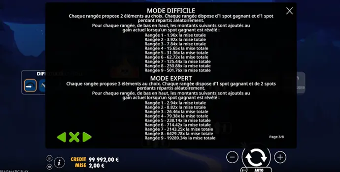 Les modes ne sont pas cosmétiques. Ils modifient la structure du risque. Plus la difficulté est élevée et davantage le nombre de cases perdantes augmente et plus les multiplicateurs progressent rapidement. Easy et Medium permettent de comprendre le jeu et son rythme. Hard impose un vrai face-à-face. Expert et Master sont des modes extrêmes, pensés pour des joueurs pleinement conscients que chaque clic peut mettre fin à la partie.